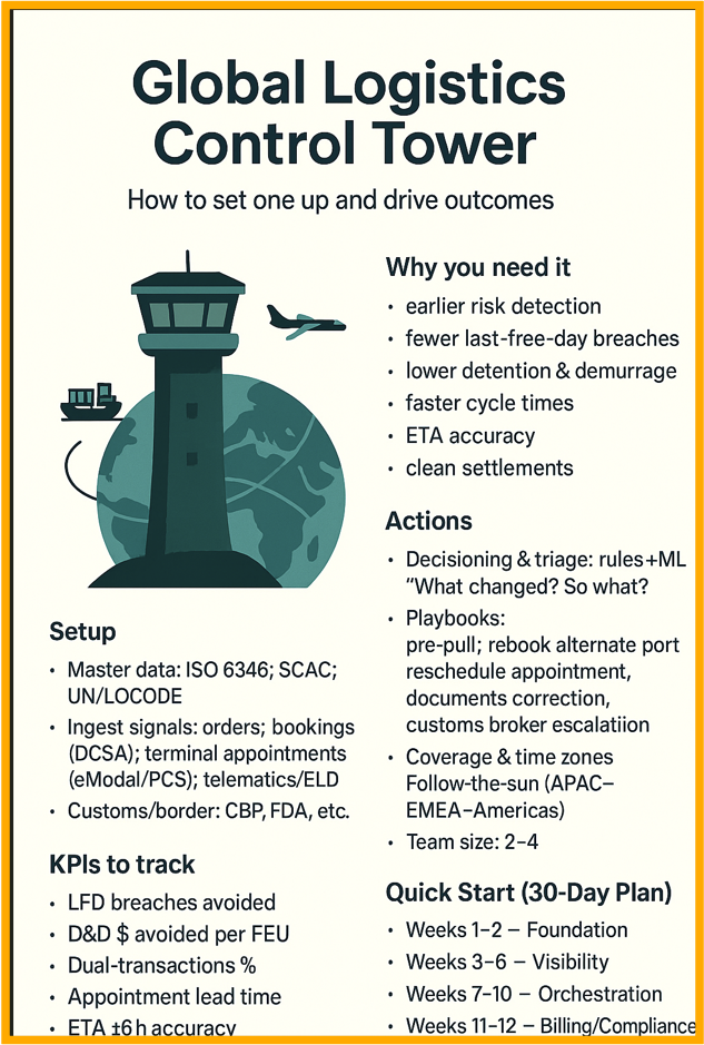 Control Tower benefits are clear: earlier risk detection, faster cycle times, fewer last‑free‑day breaches, lower detention and demurrage, more accurate ETAs, and cleaner freight settlements. Unlike a dashboard, it is accountable for outcomes and escalations.