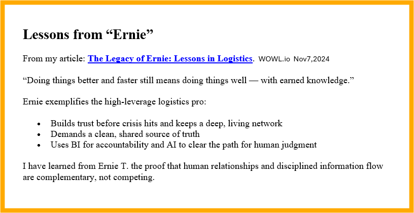 Human relationships are the multiplier in logistics and they really scale when they are connected with shared data, BI, and AI. Put people and intelligence to work together, and you’ll ship on purpose—not by accident. Shipping Happens. Be ready.